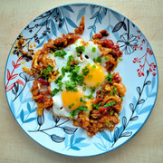No. Jutro wędzenie. A na śniadanie lubię na przykład tak. Cebula, czosnek, jalapeno, pomidory, zielenina, jajca. Energia na pół dnia.